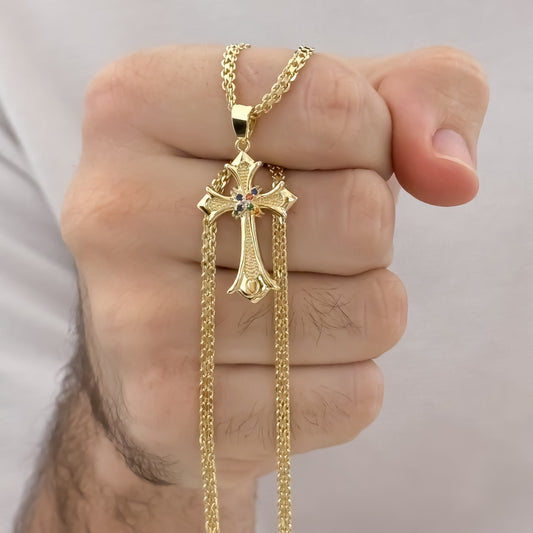 Cadena Tejido Chino de Hombre de 60cm de 3mm de Grosor + Cruz con micro circones cristales en Oro Laminado 18k con Garantia de por vida