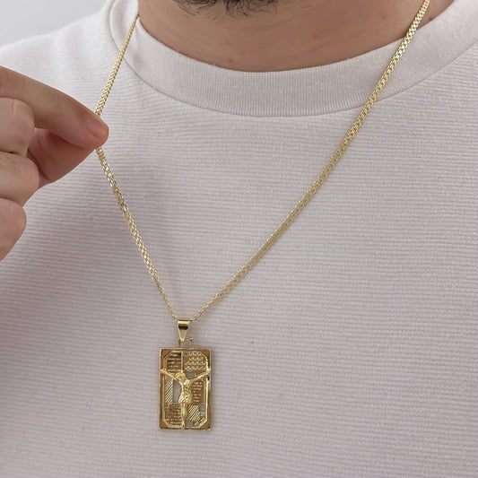 Cadena Tejido Chino de Hombre de 60cm de 3mm de Grosor + Placa Cristo Madero Libro de Jesus en Oro Laminado 18k con Garantia de por vida