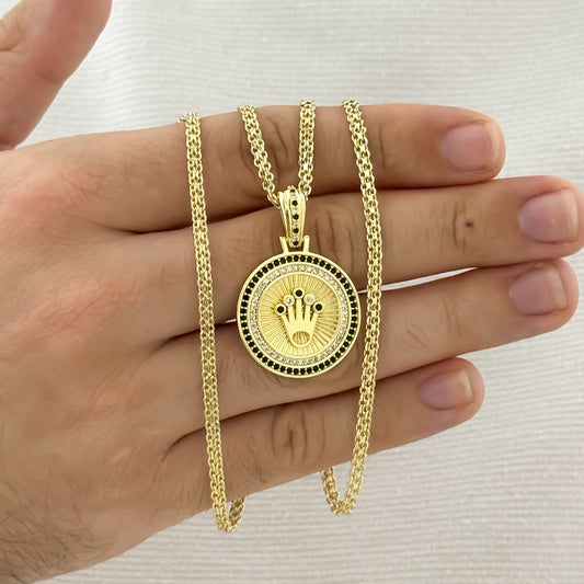 Cadena Hombre Tejido Chino 60cm -3mm de Grosor + Dije Corona Rolex Verde con Micro Circones Verde en Oro Laminado 18k con Garantia de por vida