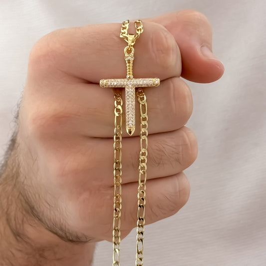Cadena Tejido Chino 60cm de Hombre de 3mm de Grosor + Cruz Clavo con Micro circones en Oro Laminado 18k con Garantia de por vida